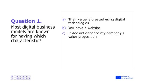 Question 1. a) Their value is created using digital technologies Most digital business b) You have a website models are known c) It doesn’t enhance my company’s for having which value proposition characteristic?