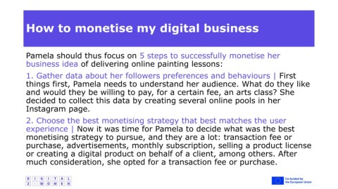 Pamela should thus focus on 5 steps to successfully monetise her