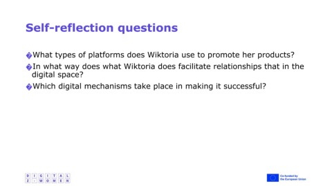 Self-reflection questions �What types of platforms does Wiktoria use to promote her products? �In what way does what Wiktoria does facilitate relationships that in the digital space? �Which digital mechanisms take place in making it successful?
