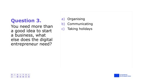 Question 3. a) Organising You need more than b) Communicating a good idea to start c) Taking holidays a business, what else does the digital entrepreneur need?