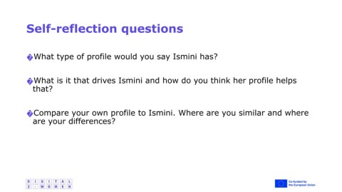 Self-reflection questions �What type of profile would you say Ismini has? �What is it that drives Ismini and how do you think her profile helps that? �Compare your own profile to Ismini. Where are you similar and where are your differences?