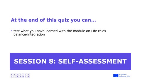 At the end of this quiz you can… • test what you have learned with the module on Life roles balance/integration SESSION 8: SELF-ASSESSMENT