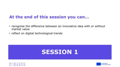 At the end of this session you can… • recognise the difference between an innovative idea with or without market value • reflect on digital technological trends SESSION 1