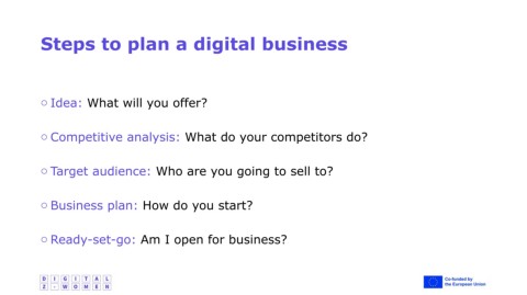 Steps to plan a digital business o Idea: What will you offer? o Competitive analysis: What do your competitors do? o Target audience: Who are you going to sell to? o Business plan: How do you start? o Ready-set-go: Am I open for business?