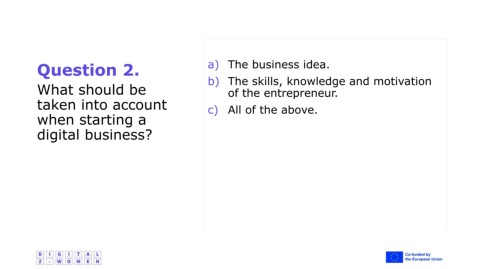 Question 2. a) The business idea. What should be b) The skills, knowledge and motivation of the entrepreneur. taken into account c) All of the above. when starting a digital business?