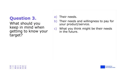 Question 3. a) Their needs. What should you b) Their needs and willingness to pay for your product/service. keep in mind when c) What you think might be their needs getting to know your in the future. target?