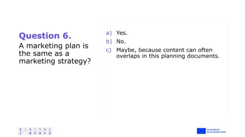 Question 6. a) Yes. A marketing plan is b) No. the same as a c) Maybe, because content can often overlaps in this planning documents. marketing strategy?